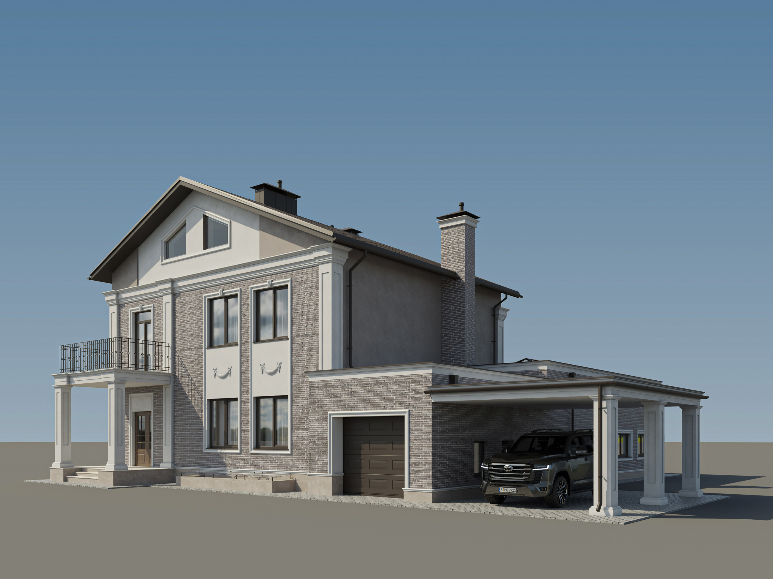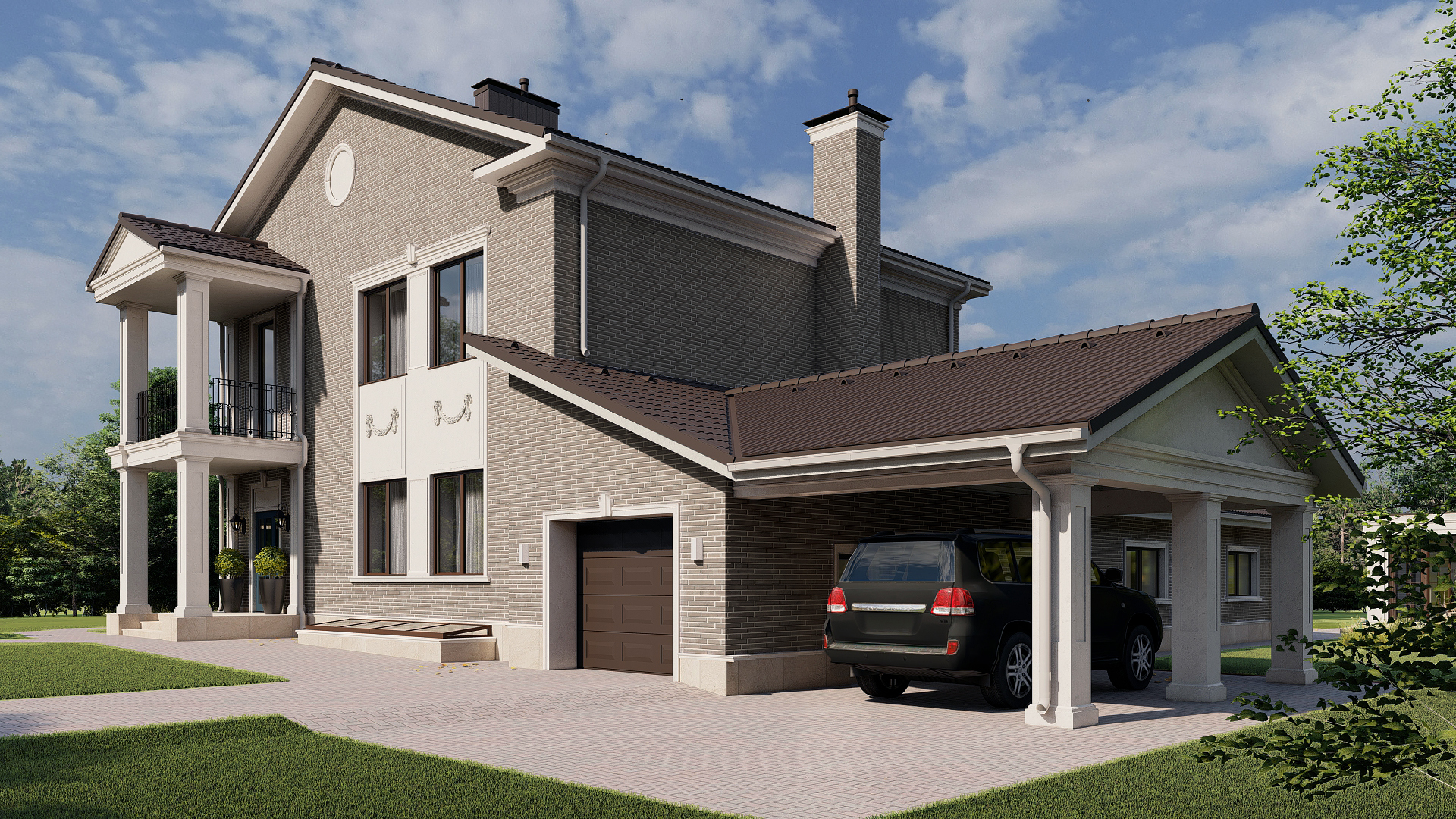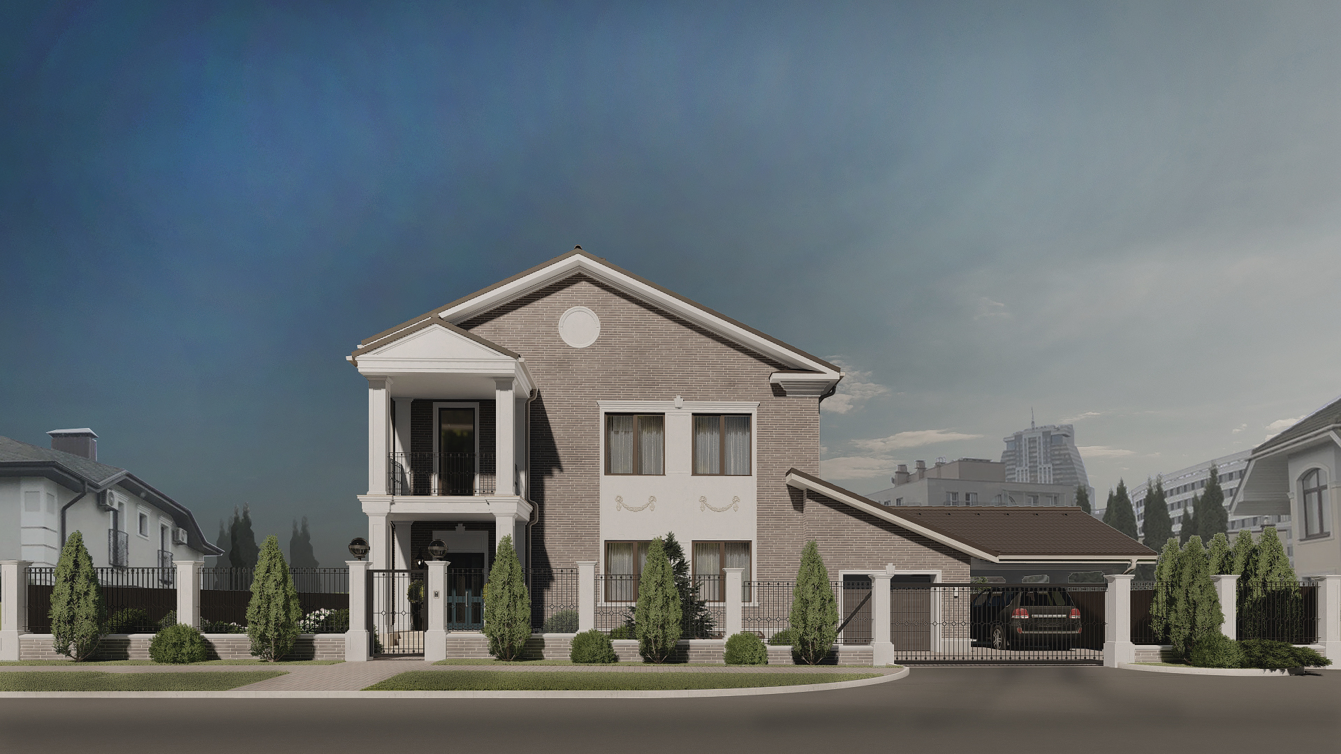 Однозначно, дом виделся в классическом духе с соответствующими элементами декора, клинкерной плиткой на фасаде, допускалось совмещение клинкера и декоративной штукатурки, кованные ограждения и забор. Также обсудили цветовую гамму фасадов дома, Заказчик высказал пожелание, что на фасадах хотел видеть теплые цвета, сложной пастельной гаммы, с оттенкам карамели, каштана, шоколада и винного. Клинкерный кирпич с эффектом состаренности.