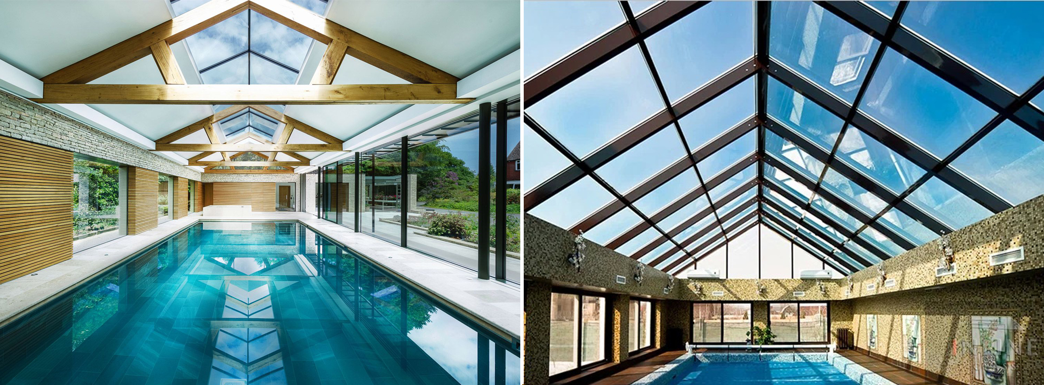 Изменили архитектуру кровли пристройки – гаража и бассейна, заменив на плоскую, включая Такое решение появилось в результате обсуждения возможного демонтажа всей кровли при реконструкции дома и монтажа нового покрытия на пристройке. Ранее, в варианте 1, были предложены мансардные окна и Заказчику эта идея понравилась. В этом варианте освещение бассейна принимает более объёмную форму через идею монтажа на кровле большого зенитного фонаря. Ниже примеры как, примерно, это выглядит: