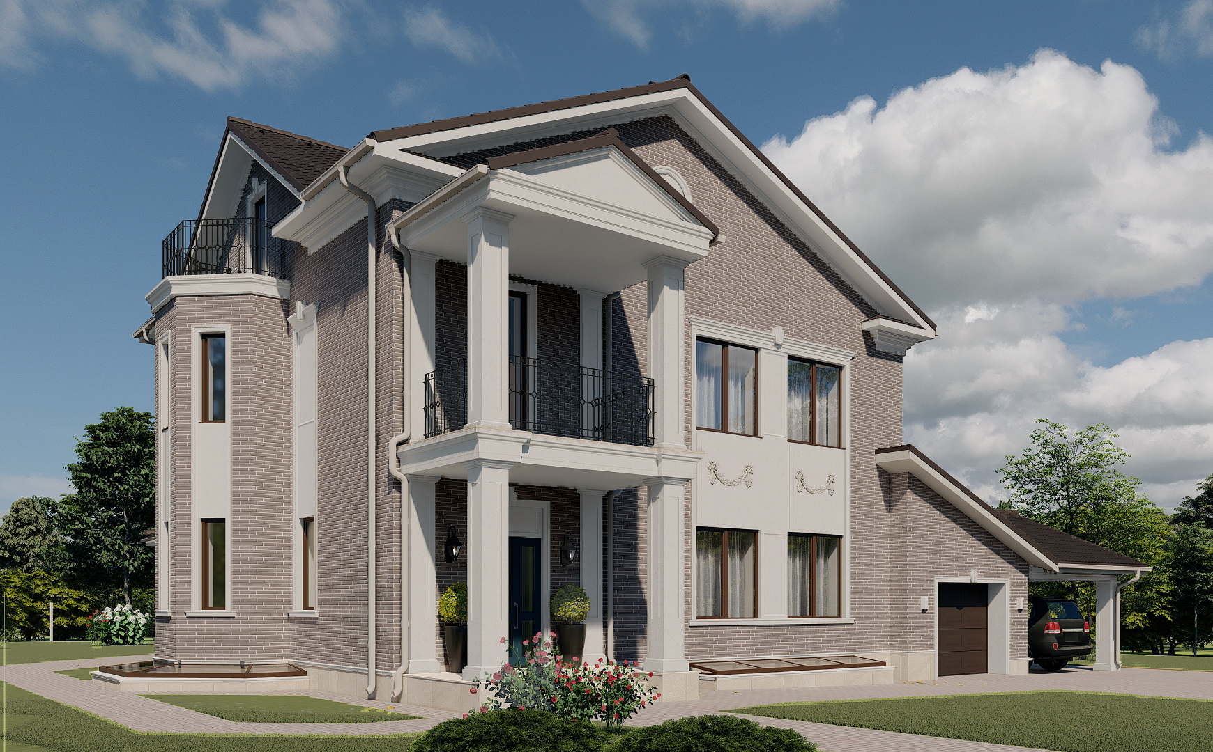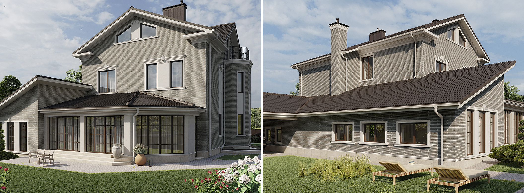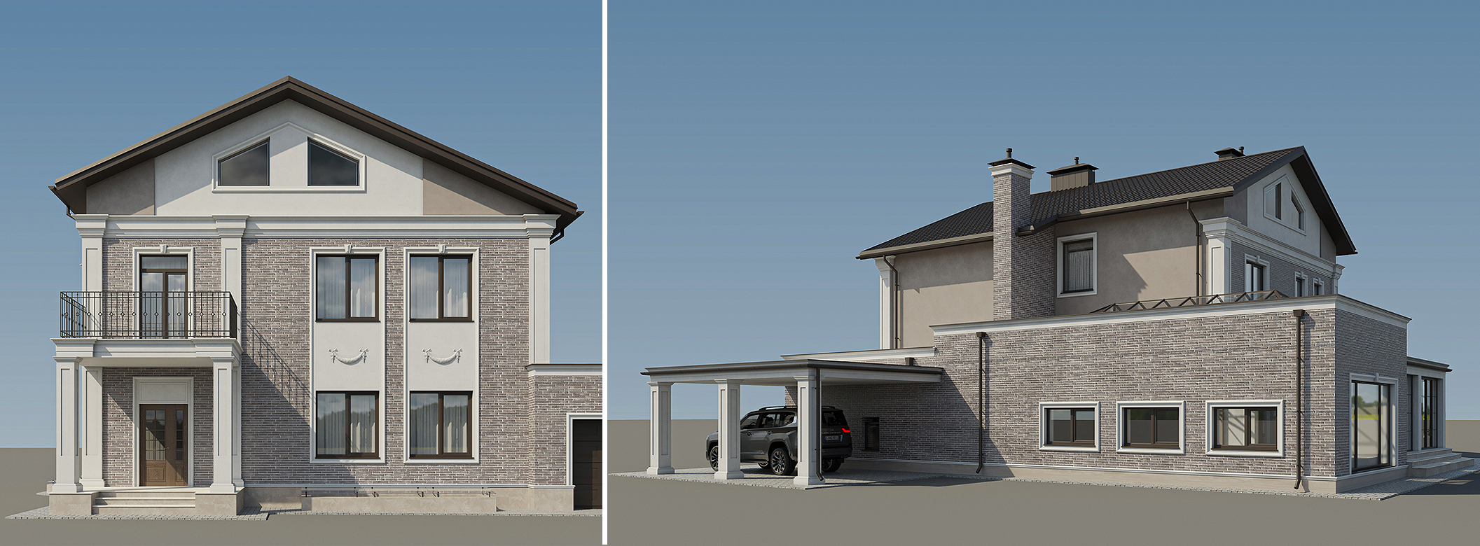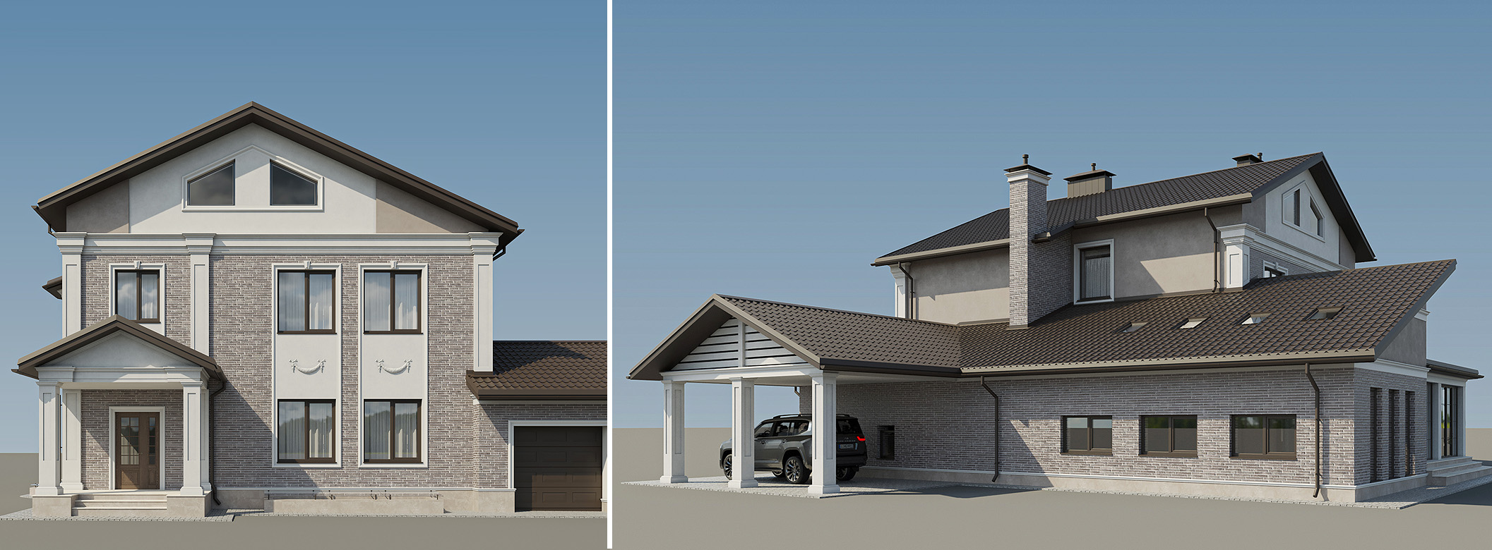 Предложили совместить на фасадах 2 вида отделки: клинкерную плитку, имитирующую кирпич ригельного типа и декоративную штукатурку 2 цветов, в гамме кирпича. Добавили классические элементы: пилястры, молдинги, карнизы и другие, выстроили зимний сад с такой же кровлей из металло черепицы как на основной кровле доме. Направление скатов кровли гаража тоже предложили изменить, выдающаяся односкатная кровля портила гармонию фасада в предложенном, классическом виде. Изменили размер окон, на парадном фасаде и дворовом, увеличение окон будет способствовать восприятию фасадов с точки зрения эстетики и гармонии дома и главное, их размер увеличит освещённость помещений внутри.
