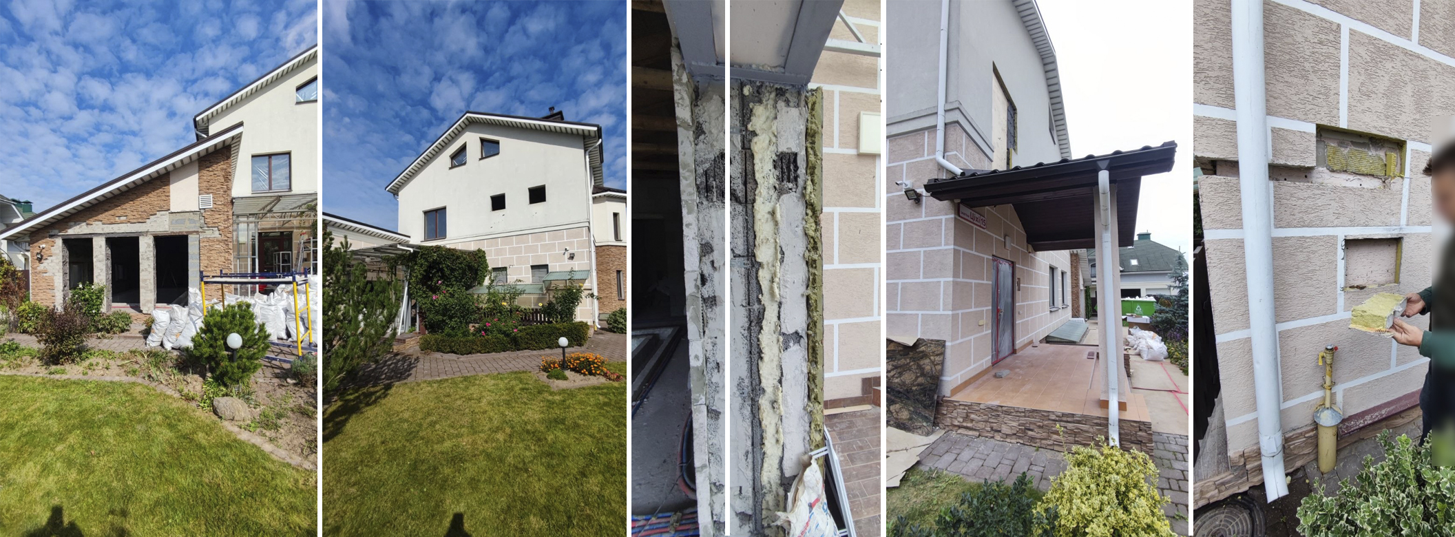 Демонтированы окна в проёмах, которые увеличиваются. Открываются скрытые места строительных конструкций. В процессе разработки проекта согласовали с Заказчиком, монтаж клинкерной плитки на утеплитель. В процессе демонтажа выяснили, что утеплитель под лёгкую штукатурную систему (что и было ранее на фасаде), поэтому его тоже надо будет демонтировать и клеить новый, с предварительной подготовкой-выравниванием стен.