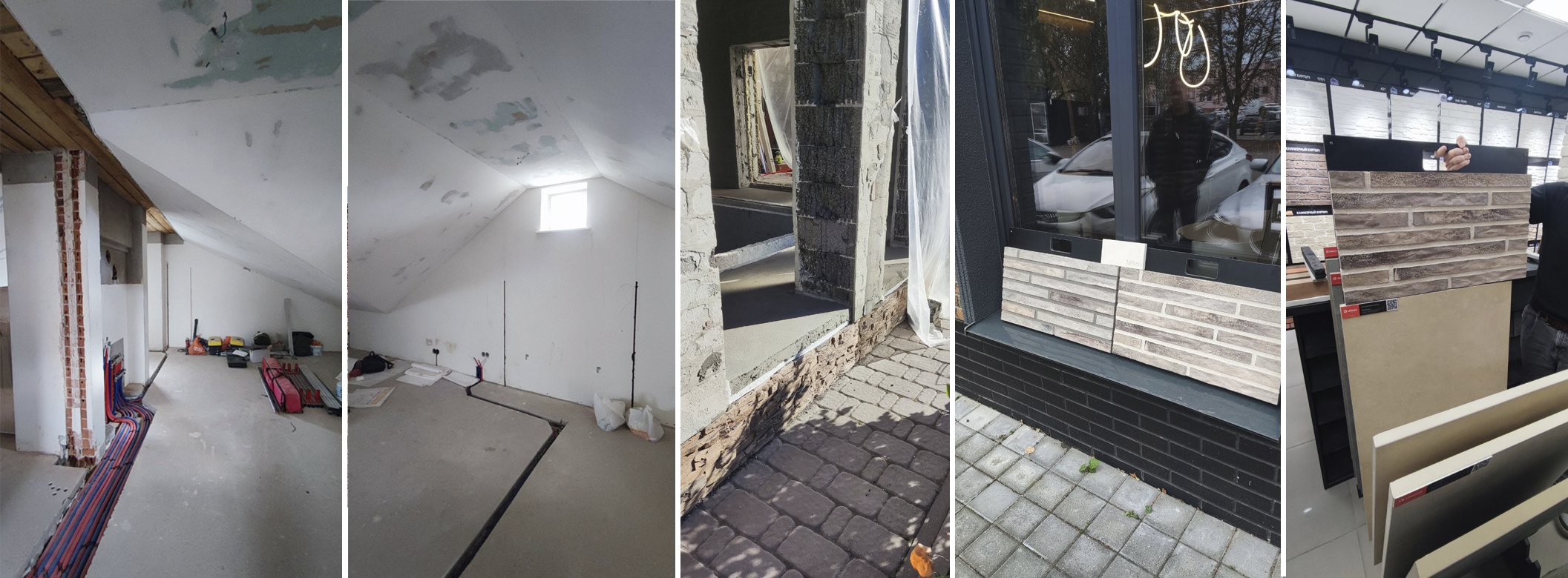 Плитка под кирпич, которая в свободном виде понравилась Заказчикам, в реальном сравнении с другими материалами была отменена по нашей инициативе, решили, что необходим более сложный и тёмный цвет каштановой гаммы. Да, дотошно подходим к выбору материалов, сравнивая с другими материалам отделки и при естественном уличном освещении.