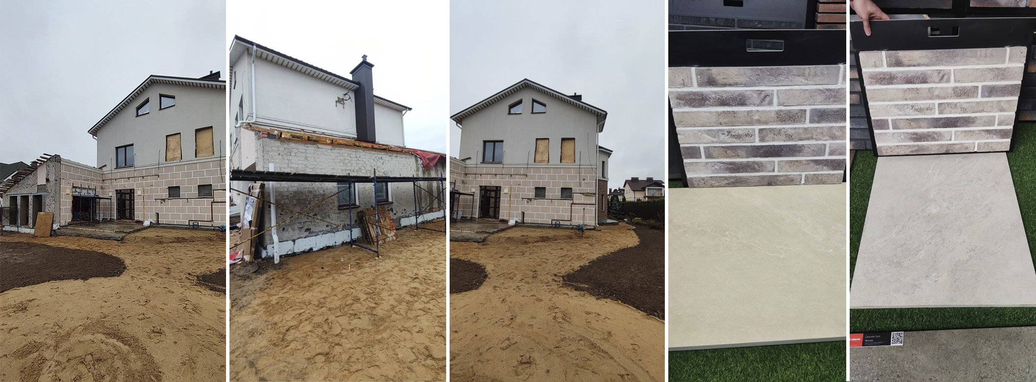 Конец ноября - начало декабря 2025 г. Активно ведутся работы по монолитным работам в беседке. После принятия решения замены кровли над пристройкой с гаражом и бассейном, решаем с Заказчиком на заменить финишные покрытия кровли дома. Убедили Заказчика, что менять часть нет смысла из-за: несовпадения в дальнейшем цветов кровли старой и новой металлочерепицы, разной волны и фактуры. Эти нюансы буду выдавать несуразность в решениях и портить общий вид дома, начали подбор цвета и фактуры металлочерепицы. Сделал дополнительное фото образцов фасадных материалов в сухую погоду, разница в цвете кирпича заметная.