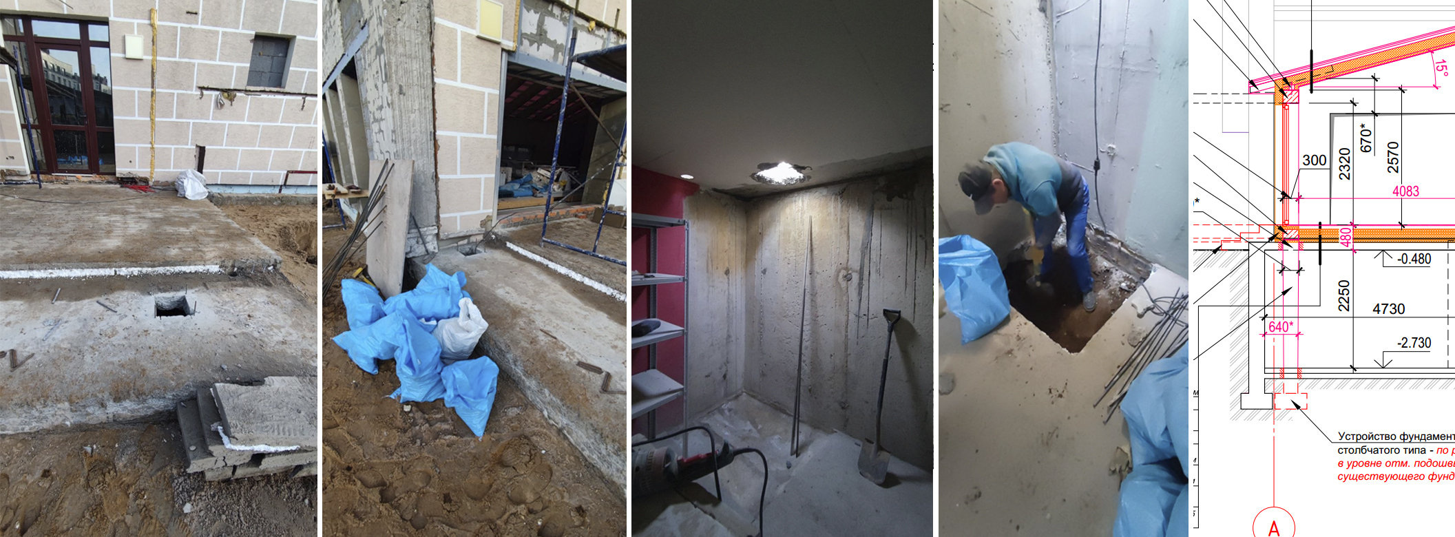Начало ноября 2025 г. Выполнены 2 отверстия для прохода опор в перекрытии террасы, ведутся земляные работы для монтажа опалубки для фундамента зимнего сада: