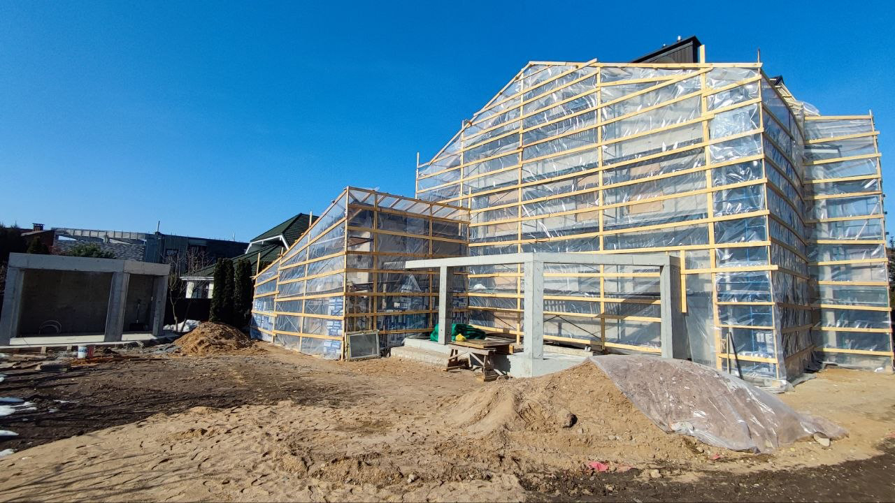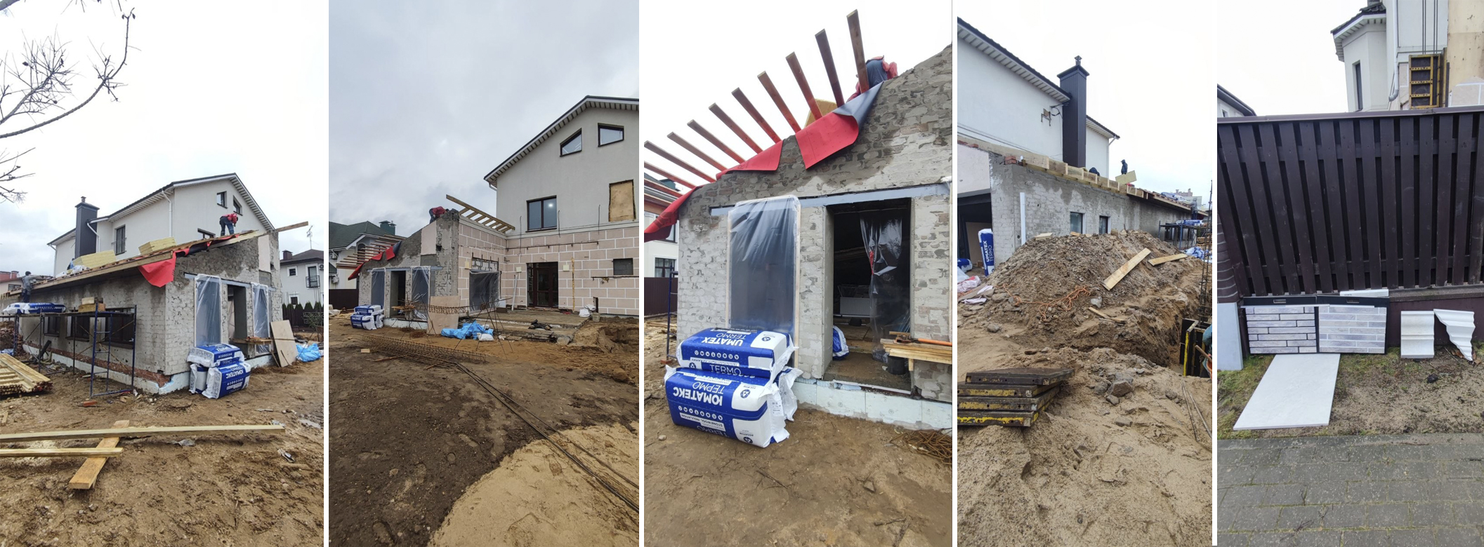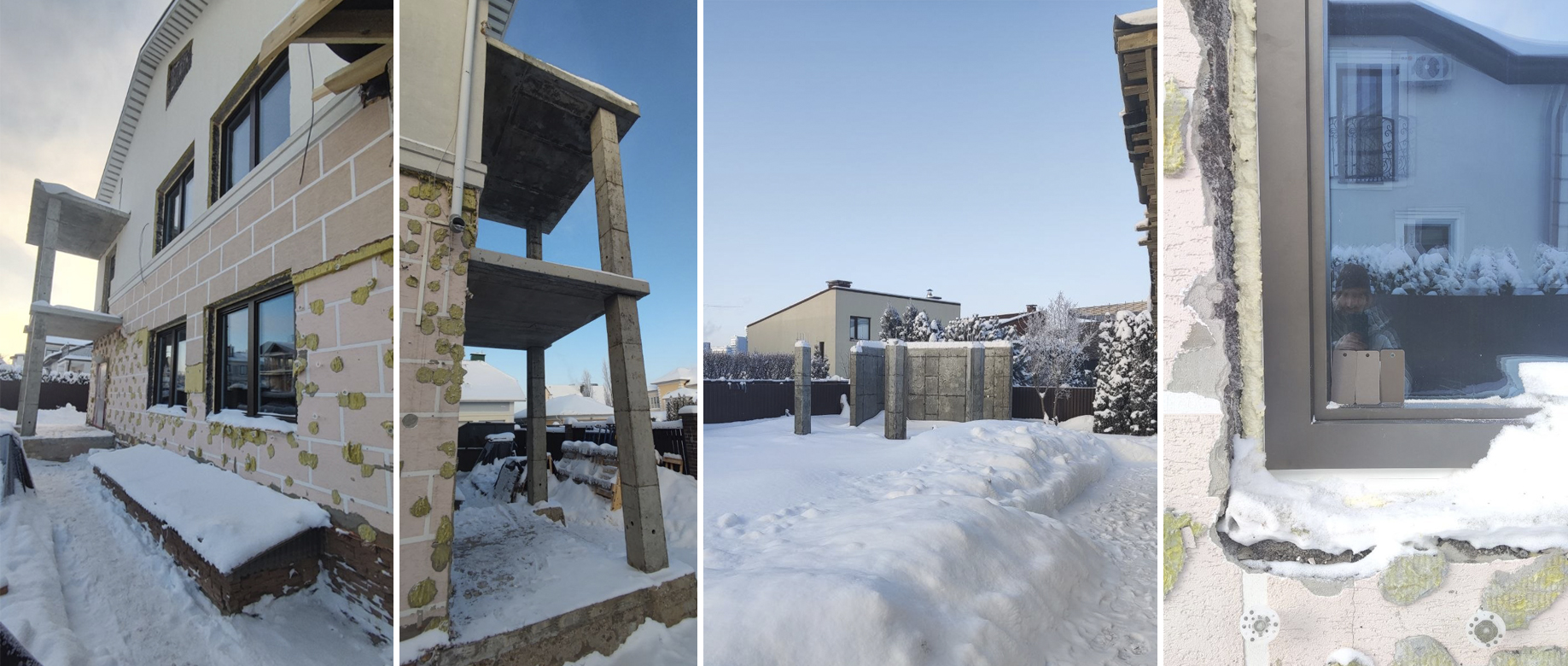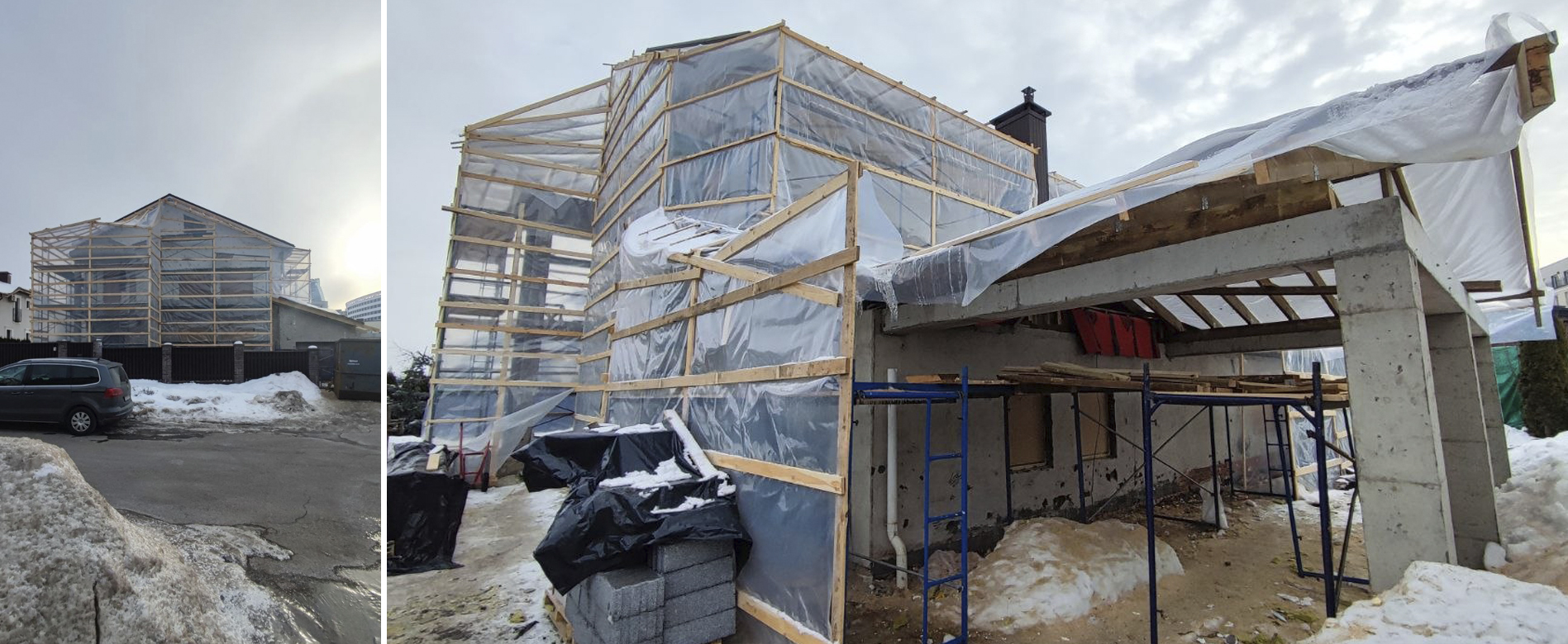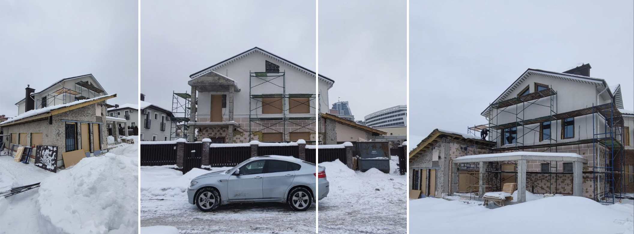 Середина февраля 2026 г. Начинается монтаж конструкций кровли навеса авто, дополнительная защита окон, монтаж лесов и дальнейший монтаж тёплого контура для фасадных работ: