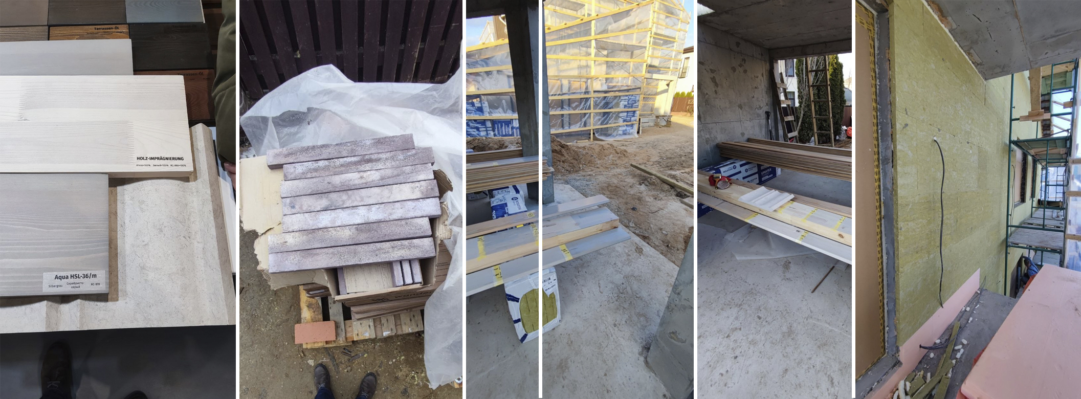 Выбор материалов и цвета тонировки дерева, первые поставка клинкерного кирпича на объект, работы по утеплению фасадов: