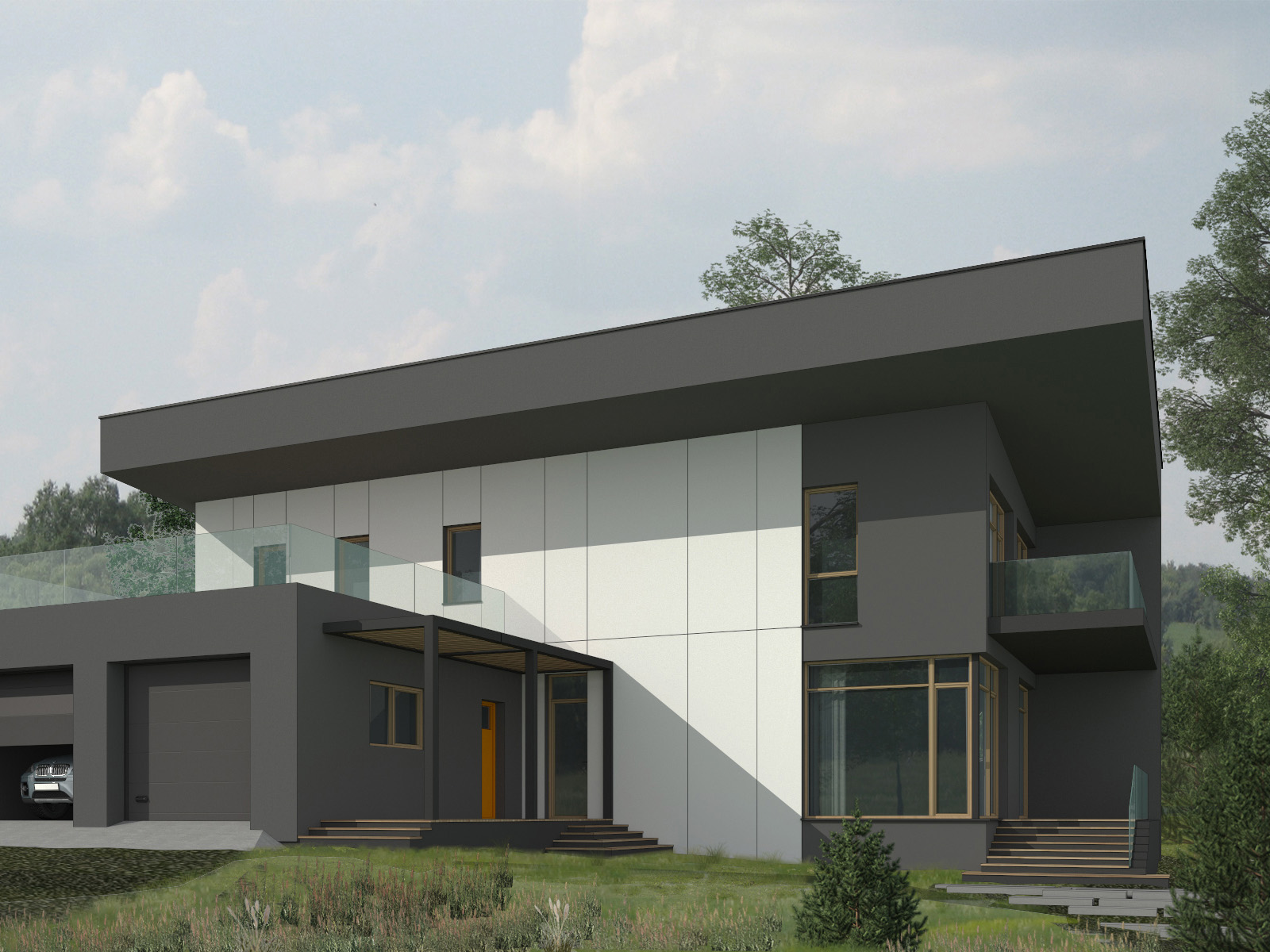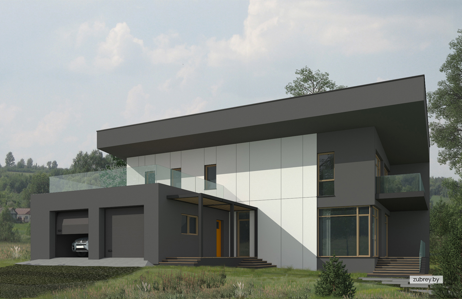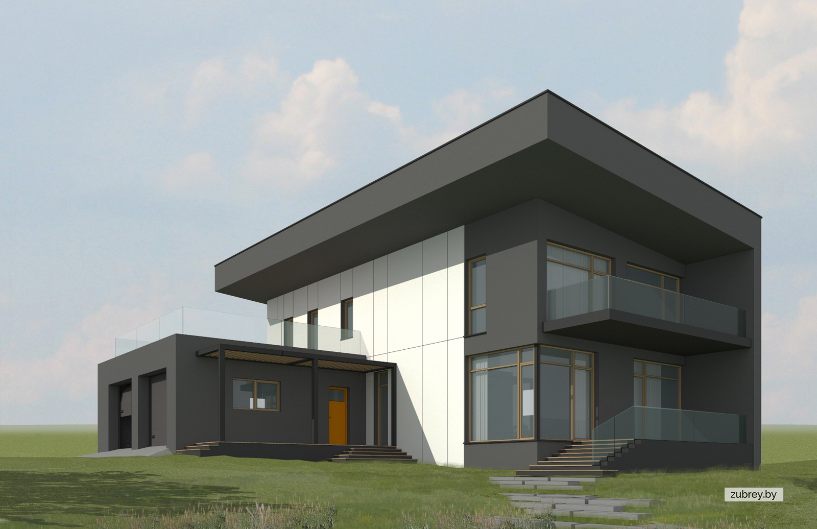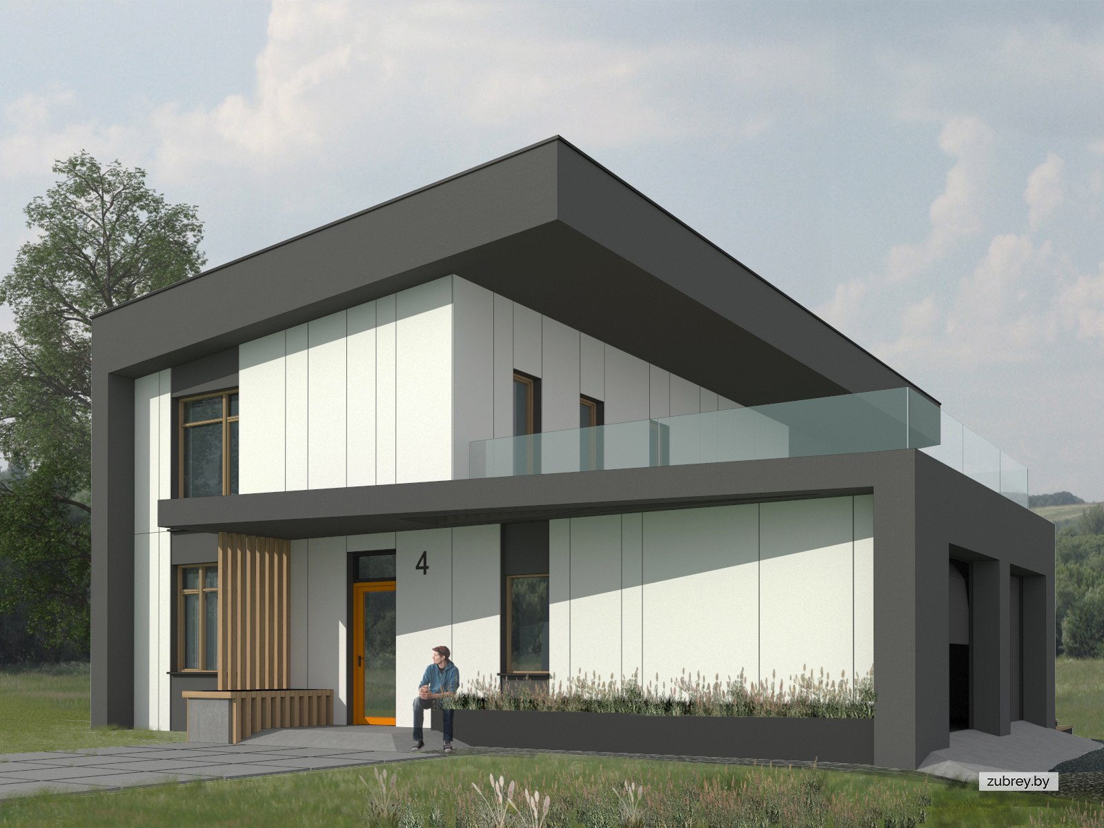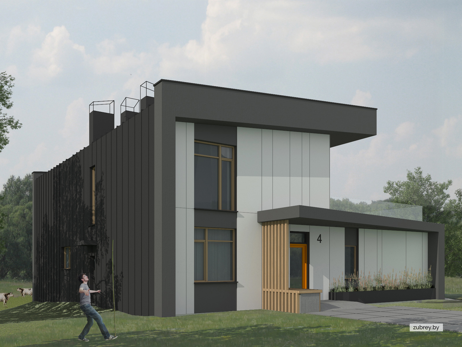 Яркой чертой дома является его односкатная кровля массивной толщины, которая переходит в наружную стену. Эта особенность задана умышленно ввиду сложной конструкции перекрытия, выполненного из деревянных ферм. Такое решение позволило сделать кровлю свободно "парящей", без привязки к несущим стенам.