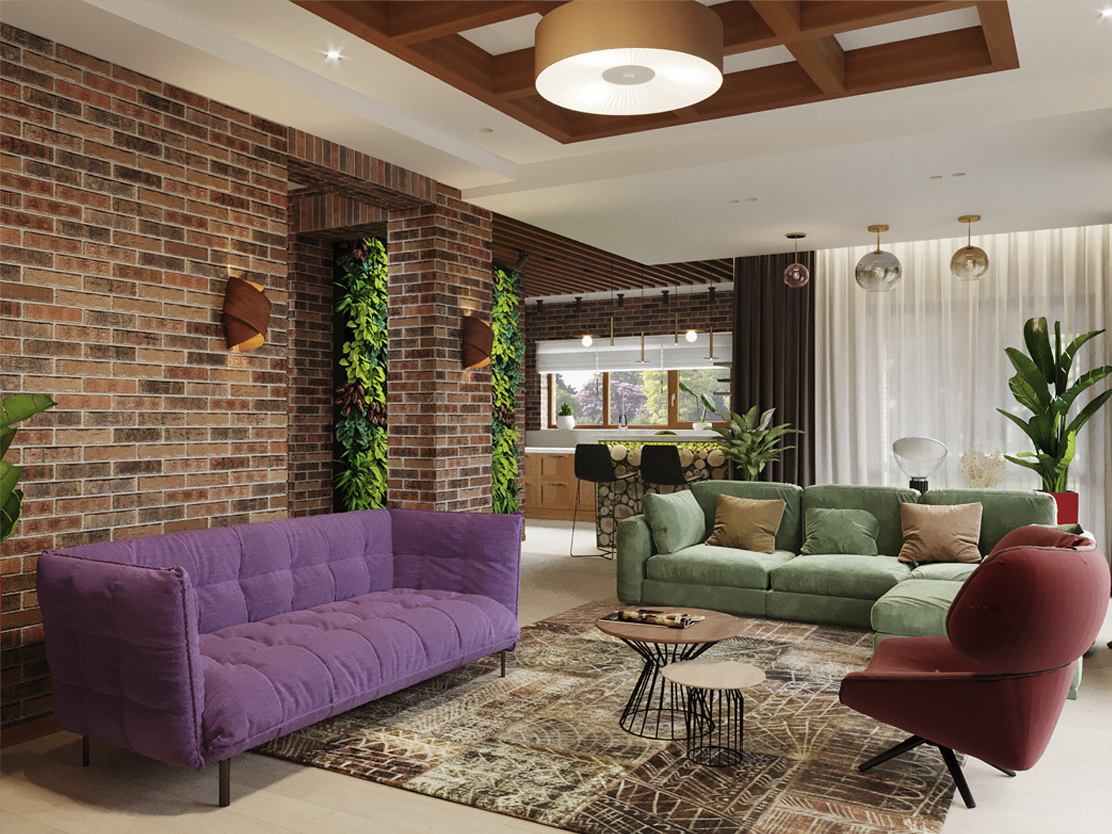 Разработать дизайн интерьера дома для молодой семьи с 2-мя детьми. Необходим стиль лофт или что-то подобное, яркие цвета и побольше комнатных растений.