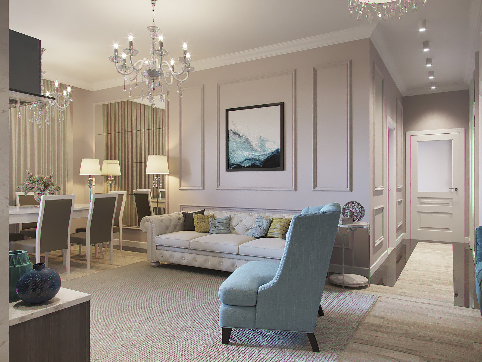 Создать дизайн интерьера квартиры с элементами современной классики в пастельных тонах с возможными улучшениями в планировке