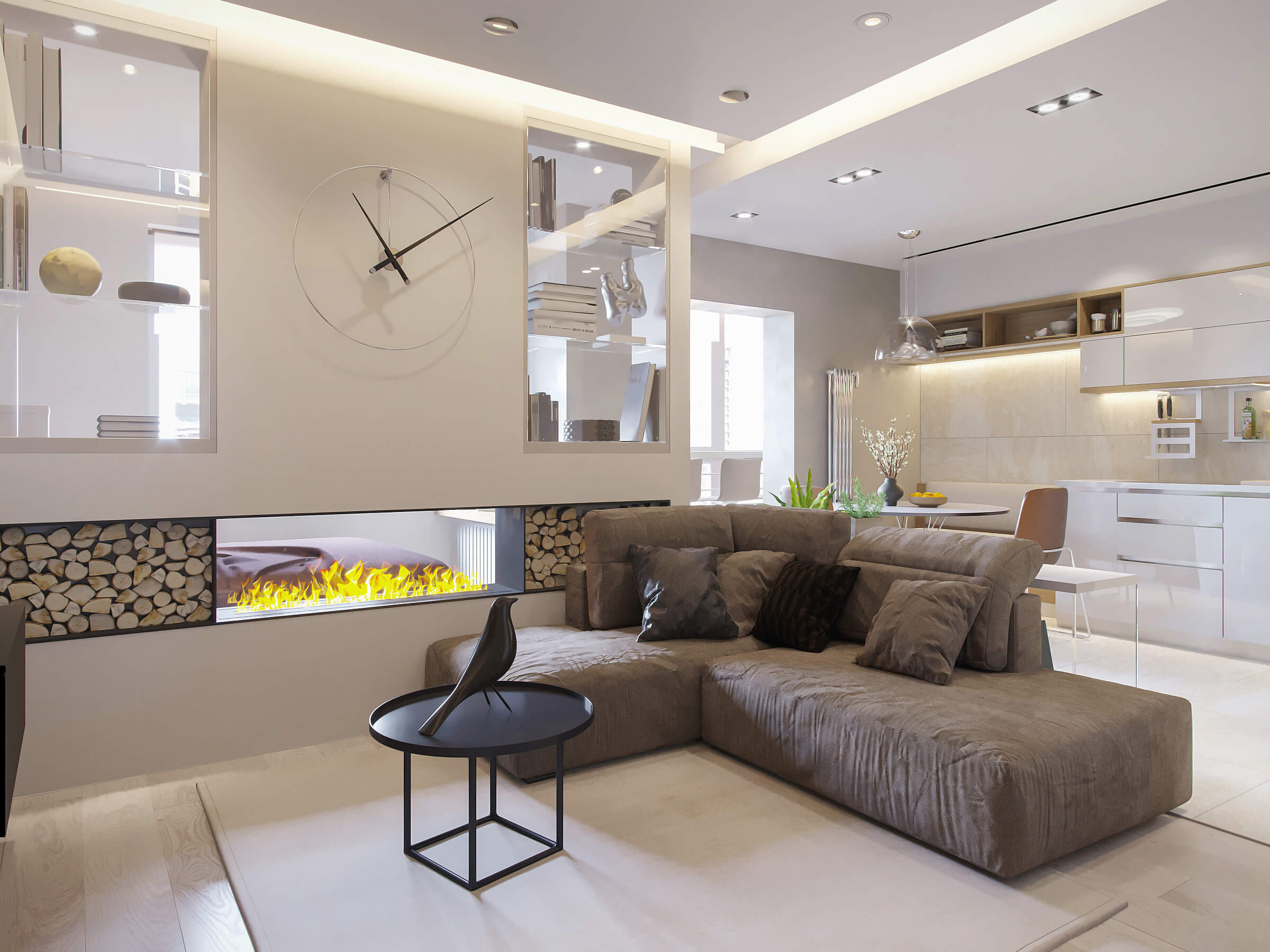 Основное пространство квартиры разделили на функциональные зоны: кухни, гостиной, и спальной зоны хозяев. Запоминающееся деталь квартиры полупрозрачная перегородка, с нишами и встроенный био-камином, которая разделяет общие и приватную зону сна. Дополнительное место отдыха за коктейлем создали на лоджии.
