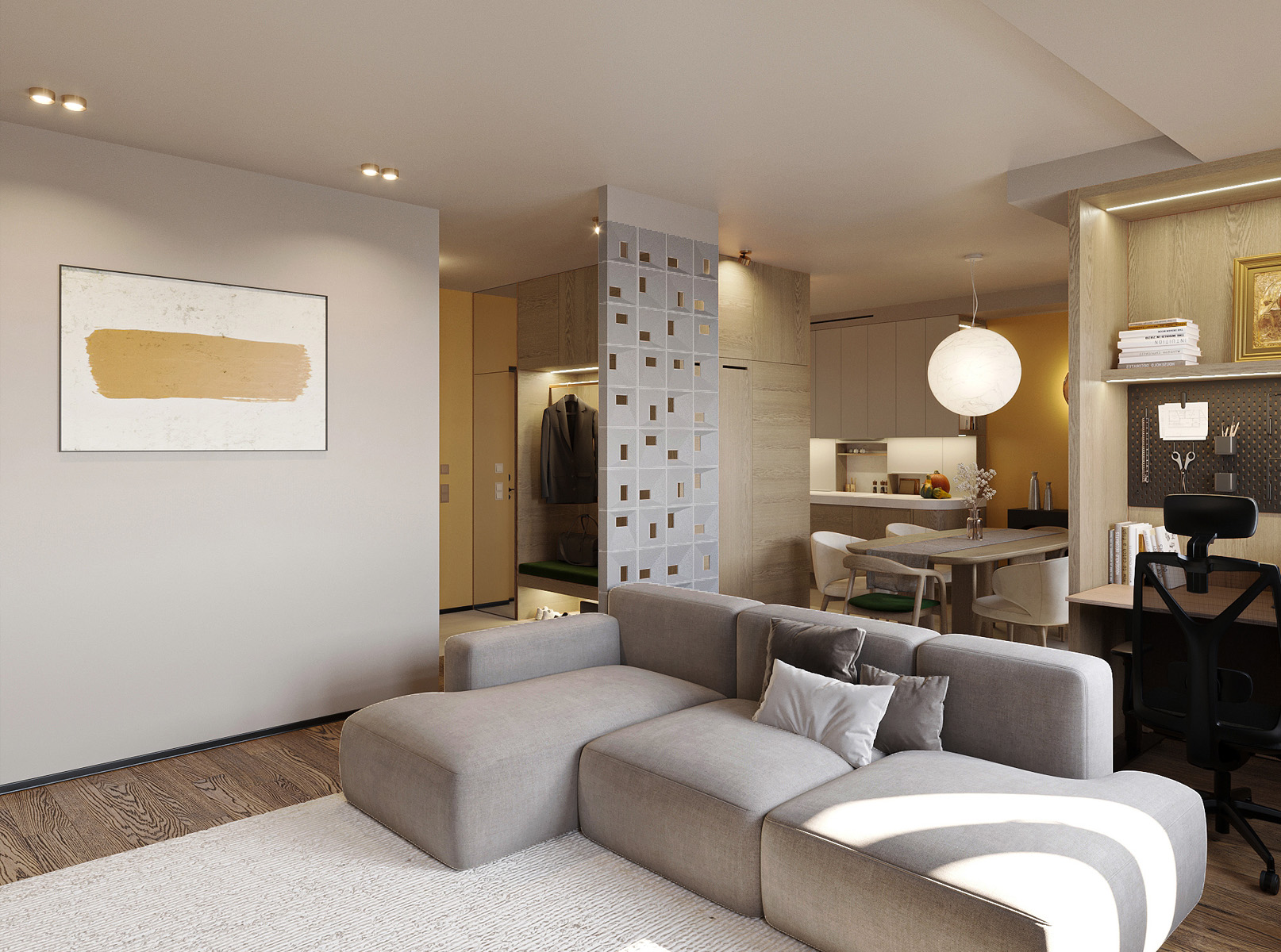 В дизайне гостиной зоны создали пространство для отдыха, общения и просмотра ТВ с выделенной рабочей зоной-кабинетом и компактной домашней библиотекой. Визуальную приватность пространства дополняет перегородка из керамических 3D-блоков с отверстиями, часть стены покрасили в глубокий графитовый цвет - визуально спрятали панель ТВ и, одновременно, «оздоровили» фон на время просмотра.
