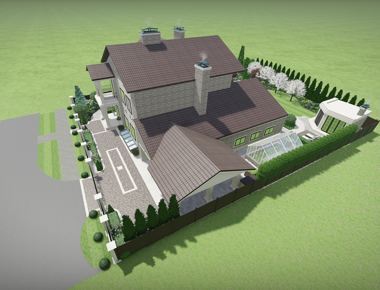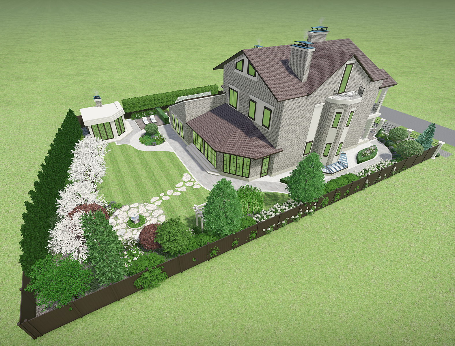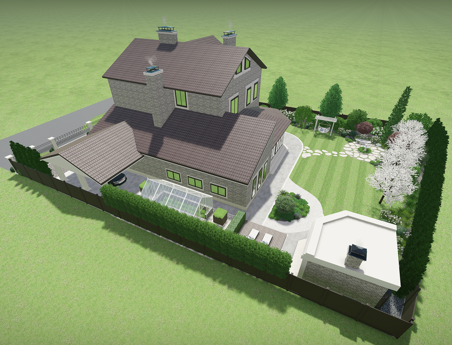 Разработать дизайн благоустройства участка вместе с реконструкцией дома и появлением новых объектов беседки и навеса для авто.