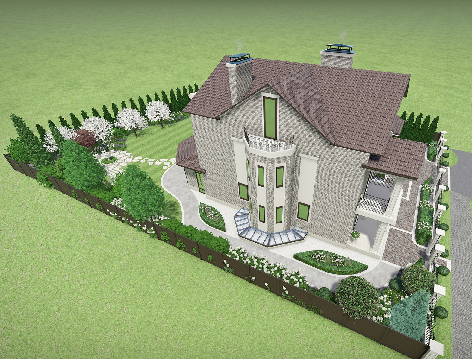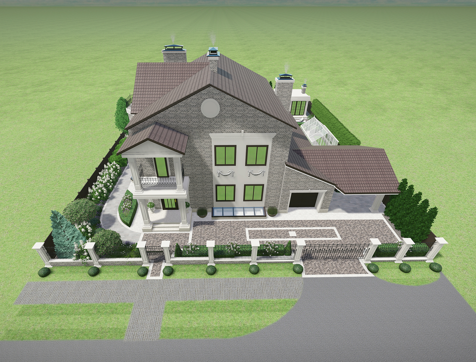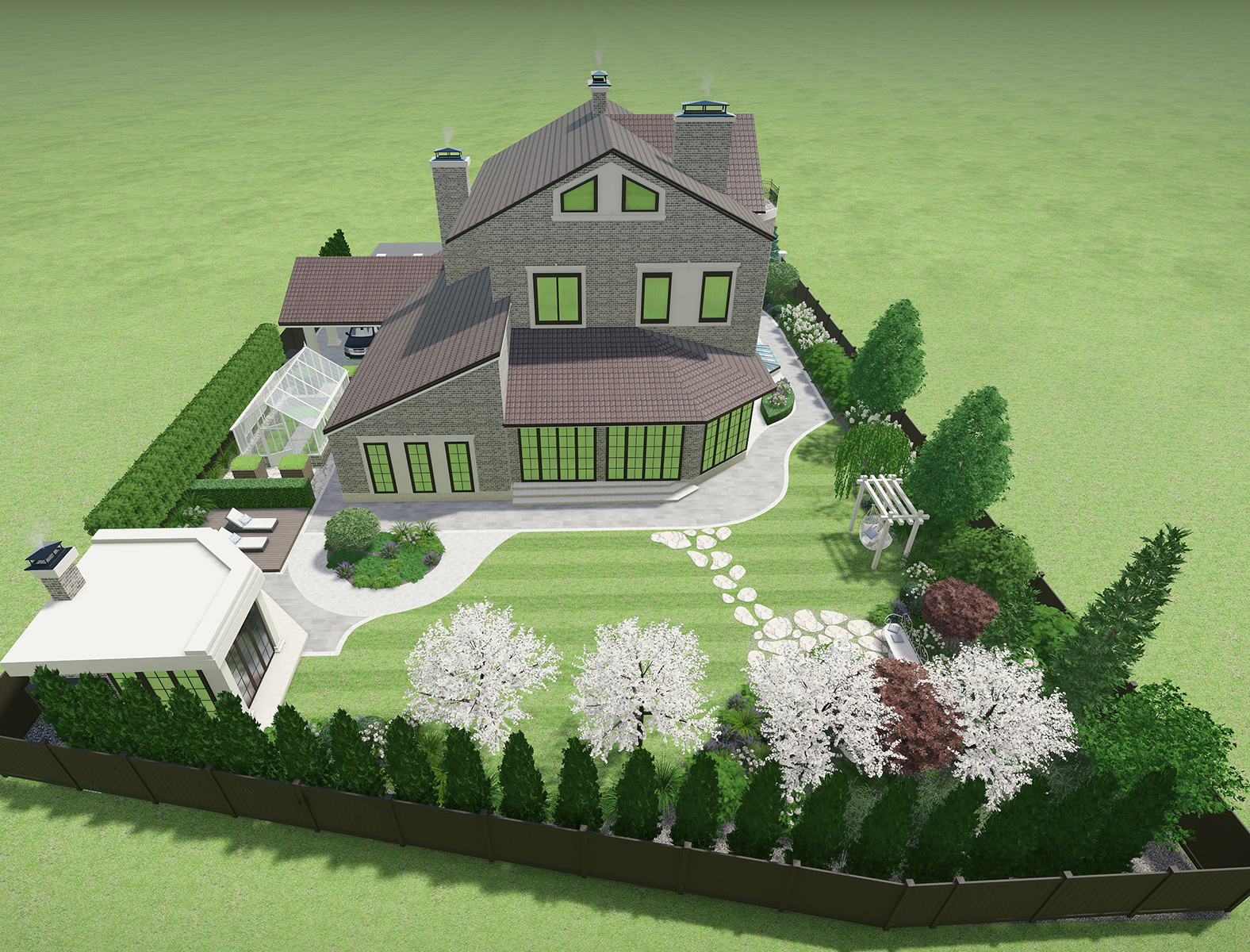 Разработать дизайн благоустройства участка вместе с реконструкцией дома и появлением новых объектов беседки и навеса для авто.